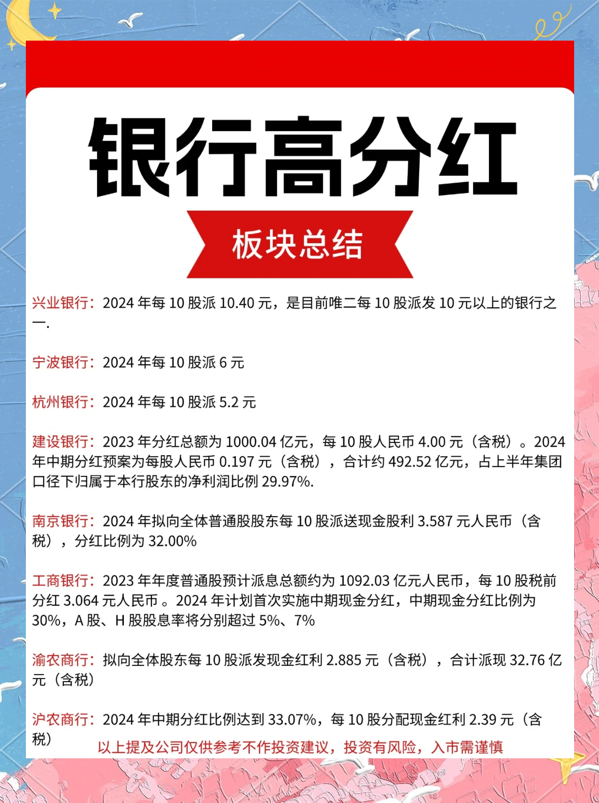3、区域性和互联网银行:区域性银行受地域、业务规模等因素限制,其分红策略可能更加灵活多变,而互联网银行作为新兴业态,更加注重与股东共享发展成果,以吸引更多投资者。
